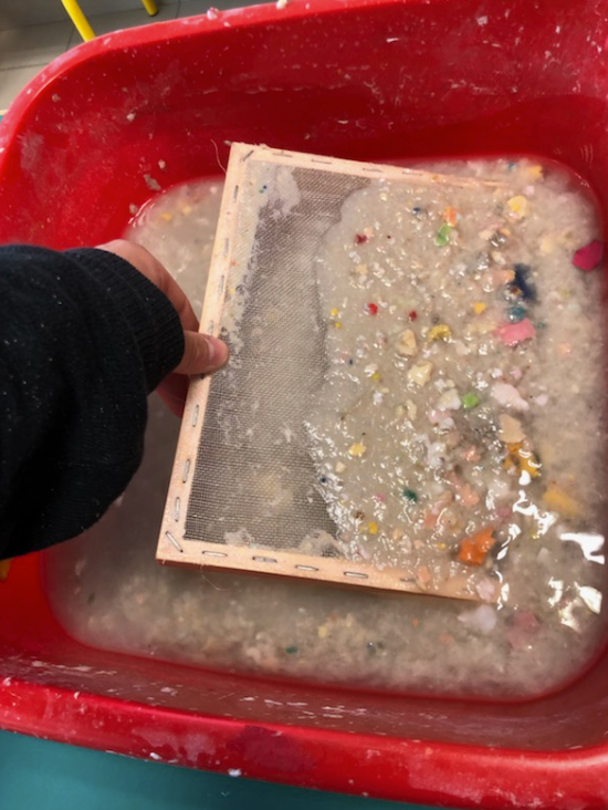 Même s’ils font attention tout au long de l’année à ne pas gâcher de papier, les élèves de GS ont utilisé les quelques feuilles qui allaient être jetées pour fabriquer du papier.